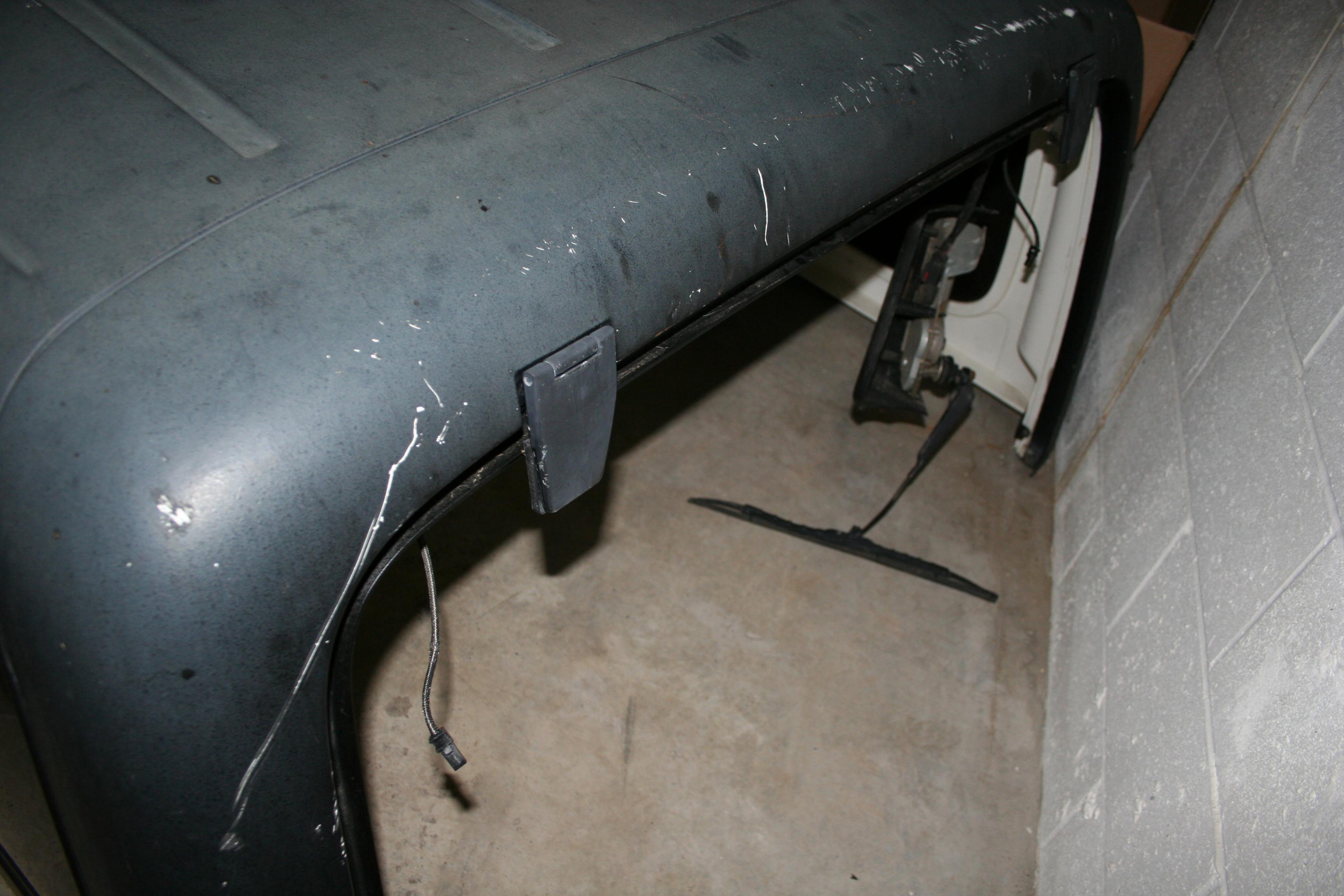 I got this hard top for twenty bucks. It has a few scratches I can easily sand down and cover with herc. I need a new rear window glass, but the defrosters, wiper motor and arm, and hinges are there. There is one good sized chunk missing, (see pic), but all in all, 20 bucks seemed good to me.