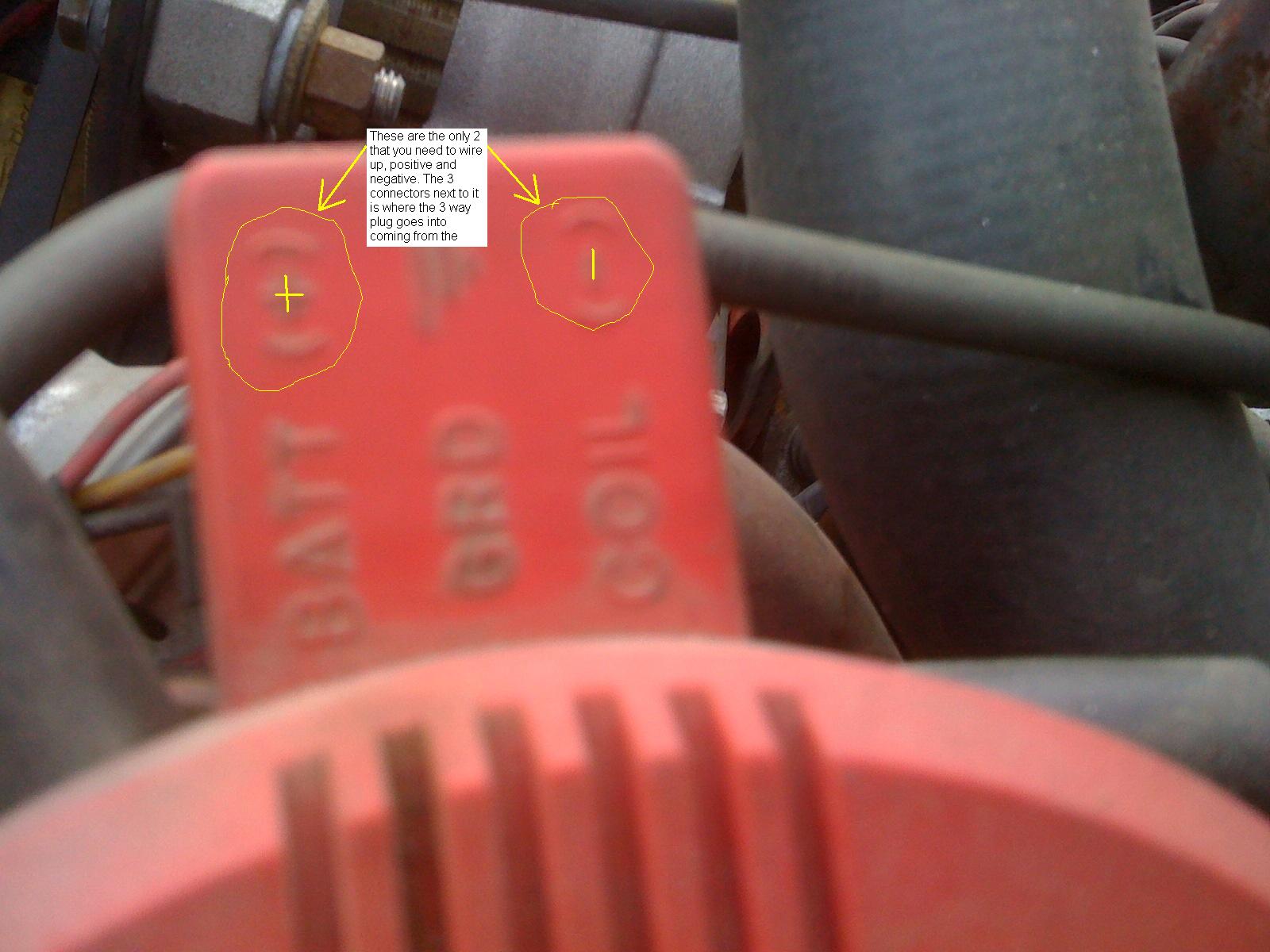NNoooooooo!! don't use an external coil. THe HEI already has its own coil and ignition module inside the distributor. That 3 wire connector plugs into the 3 way on the distributor cap. The only wires you need to install are the 2 wire connector next to the 3 way on the distributor cap. I took a picture of the top of my distributor. The 2 on the outside section is the only 2 wires you need to hook up.