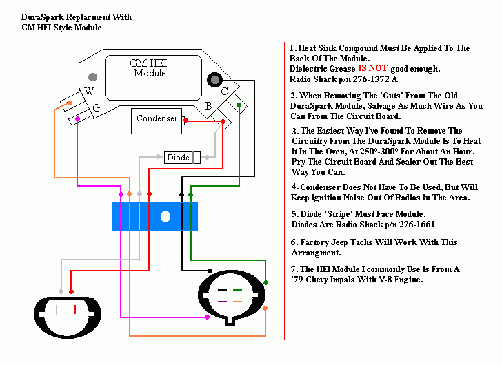 The HEI does not use an external resistor or coil. The coil is inside the distributor cap along with the ignition module. The wiring simplifies it to just 2 wires. Here's an illustration i found on the net.