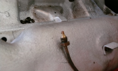 What you have in this picture is an electronic sending unit. The Mechanical coolant temp. gauge does not use a sending unit since the probe is attached to the copper line going to the rear of the temp. gauge. All you need to do is find a water port in the intake to screw it in. On the first pic i showed you, i used an adapter fitting to get the probe mounted properly since the threaded hole on the intake is larger than the fitting on the probe. Also, use a PTFE sealant on the threads to keep it from leaking. On the last pic., I have a fitting block that is attached to the side of the engine block . Directly at the end of it is the oil pressure line for my oil pressure gauge. I removed the electronic oil pressure sending unit since i was not going to use it and just installed a plug on the hole hich is what you see facing upwards towards the camera.